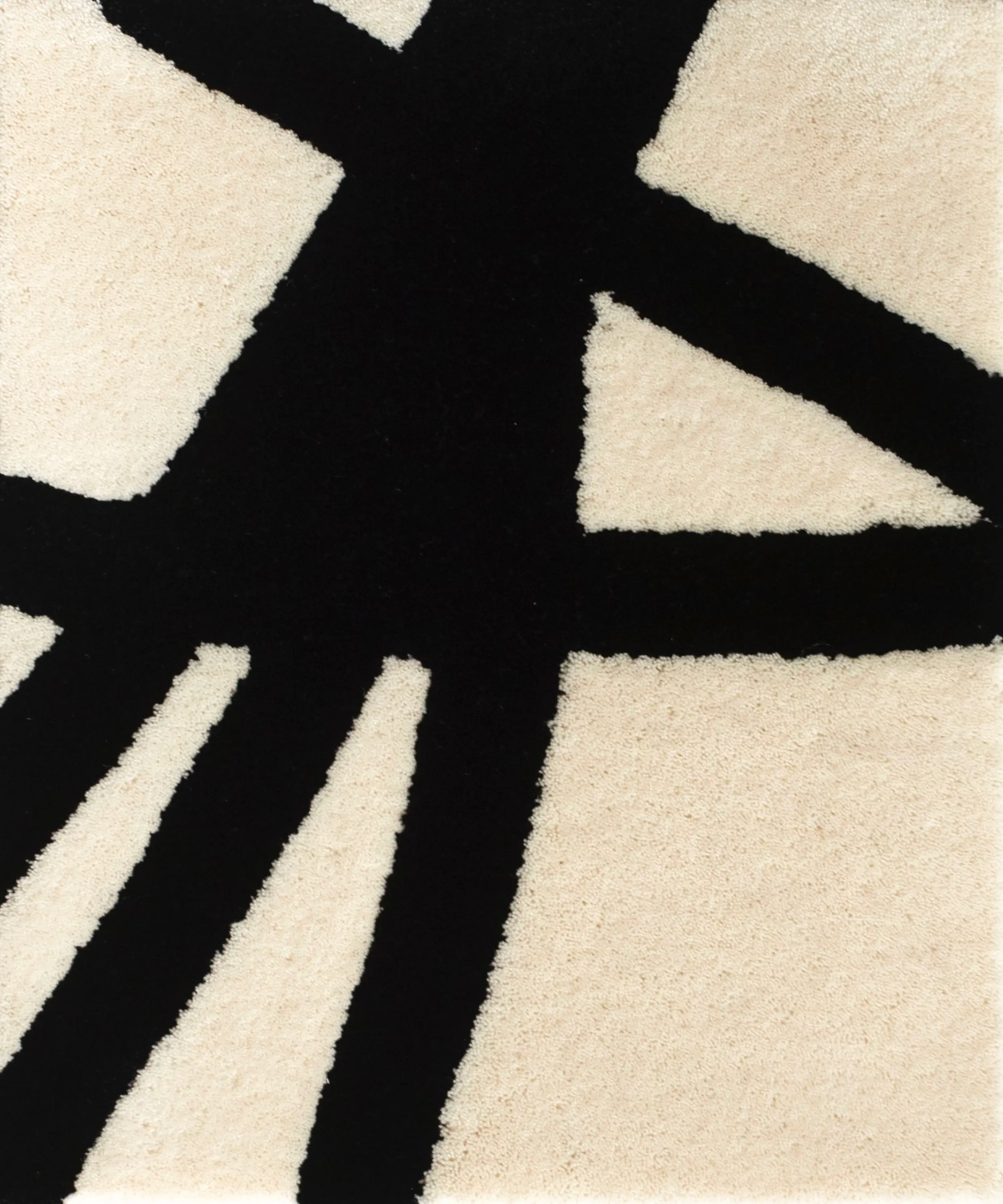 Le contraste du noir profond et du blanc lumineux donne au tapis une force graphique immédiate. Cette dualité affirme le dessin tout en laissant respirer l’espace, entre tension et équilibre, rythme et silence. Les lignes semblent presque tracées à la main conservant une spontanéité et une énergie libre.