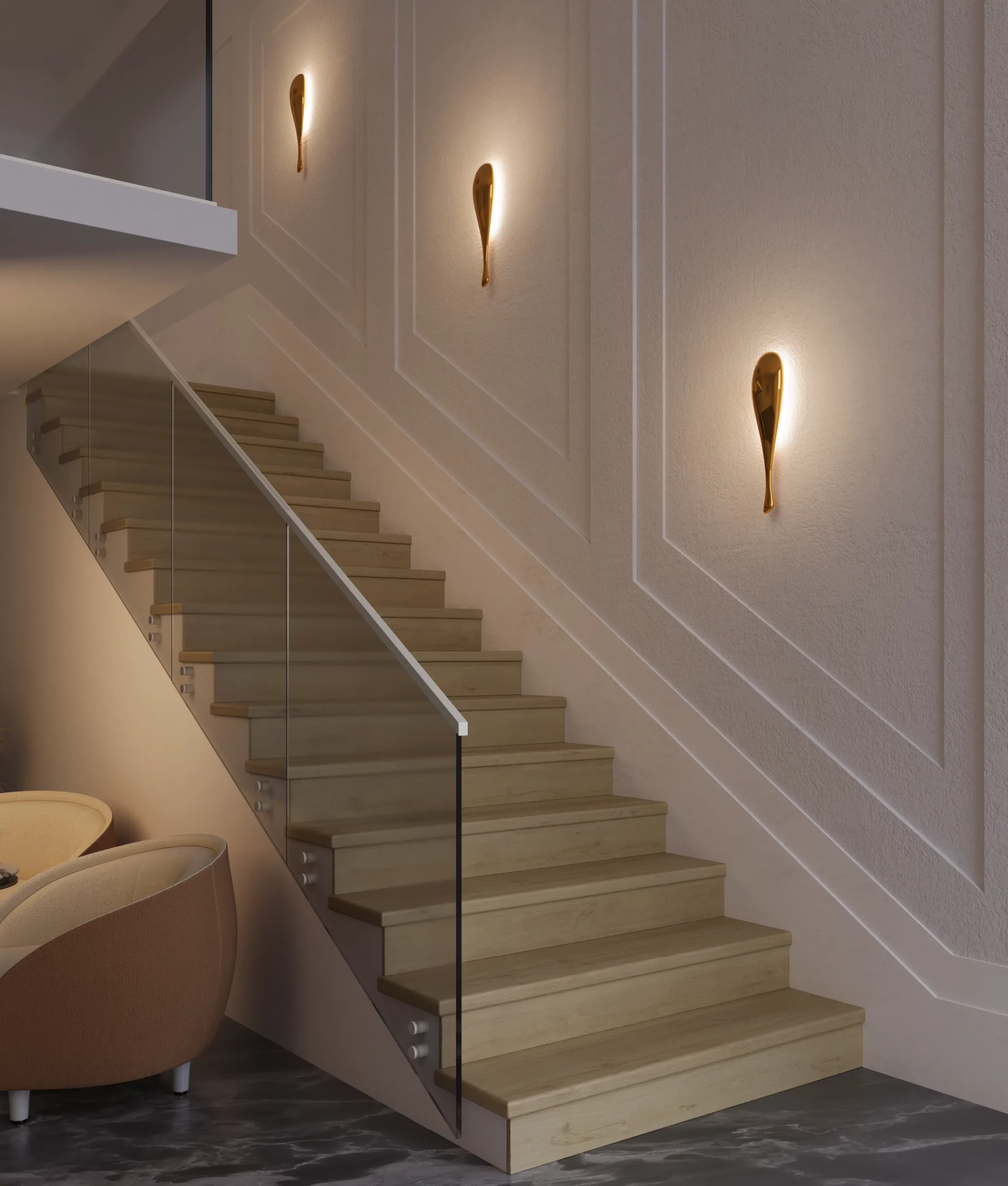Mit ihrem fließenden, organischen Design erinnert die goldene Wandleuchte an die Bewegung des Wassers oder an die anmutige Bahn eines Wals. Ihre eleganten Kurven streuen das Licht sanft und projizieren einen goldenen, umhüllenden Lichtschein auf die Wand. Dieses Spiel aus Schatten und Reflexionen verleiht dem Raum eine neue Tiefe als würde das Licht selbst zu Materie werden.
