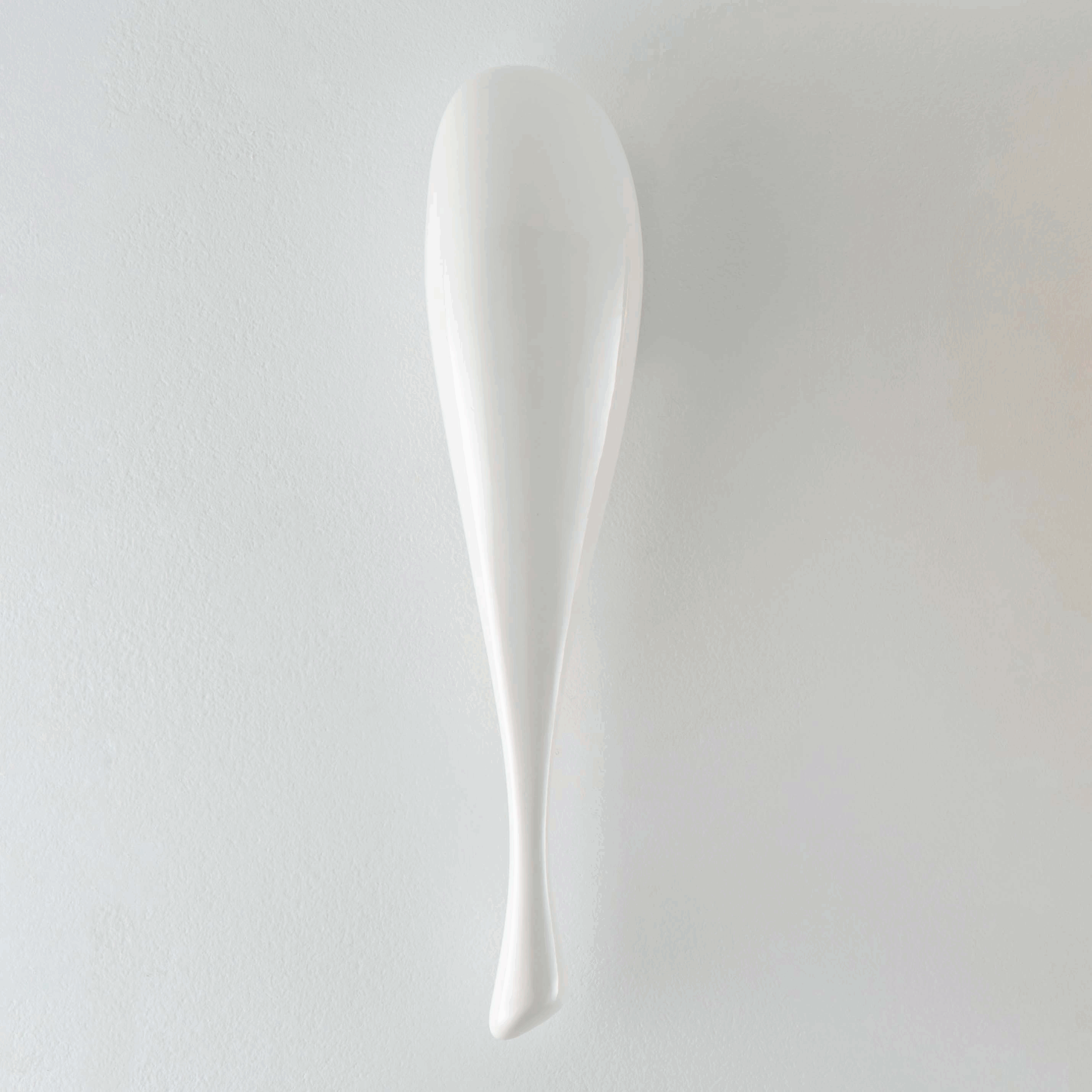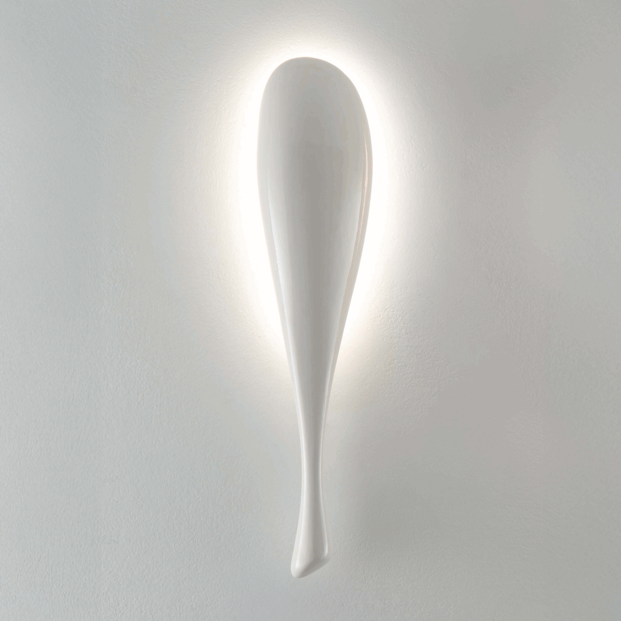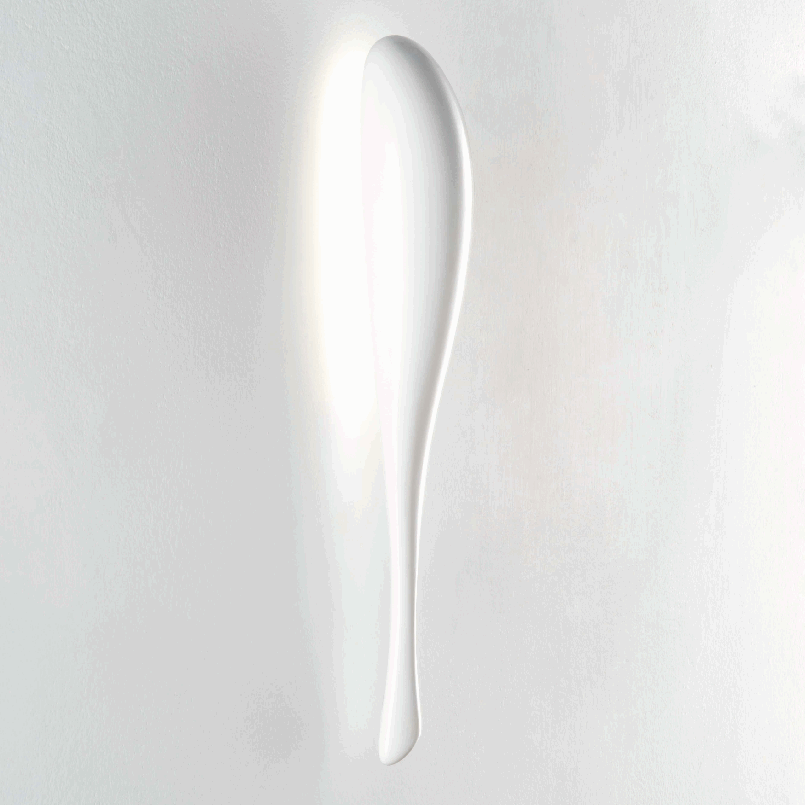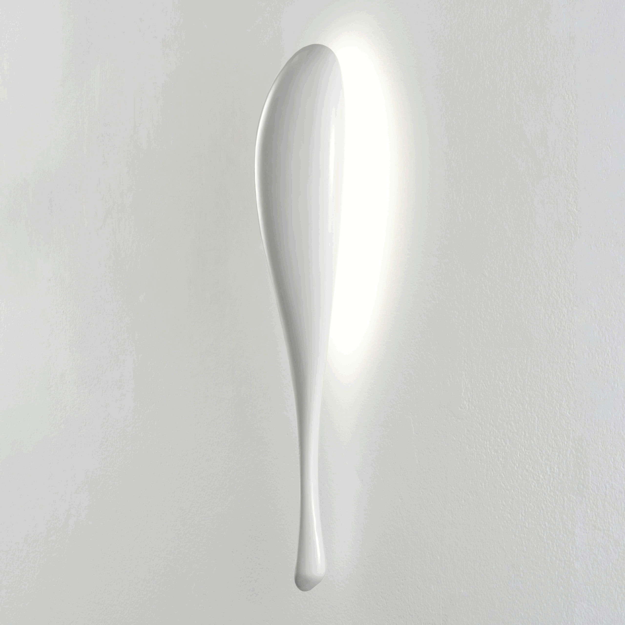 Its organic, airy design evokes the grace of an aquatic form suspended in motion. Like a droplet of water frozen mid-flow, it captures the moment when fluidity becomes volume. Mounted on the wall, it seems to float, diffusing from the upper rear side a soft, enveloping halo that enhances the space without dazzling it. This indirect light creates a soothing atmosphere in which the glossy white acts as an amplifier of clarity and lightness.