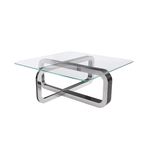 La structure en acier inoxydable poli est fabriquée artisanalement. Le plateau de verre arrondi dans les angles est proposé en finition extra-claire.