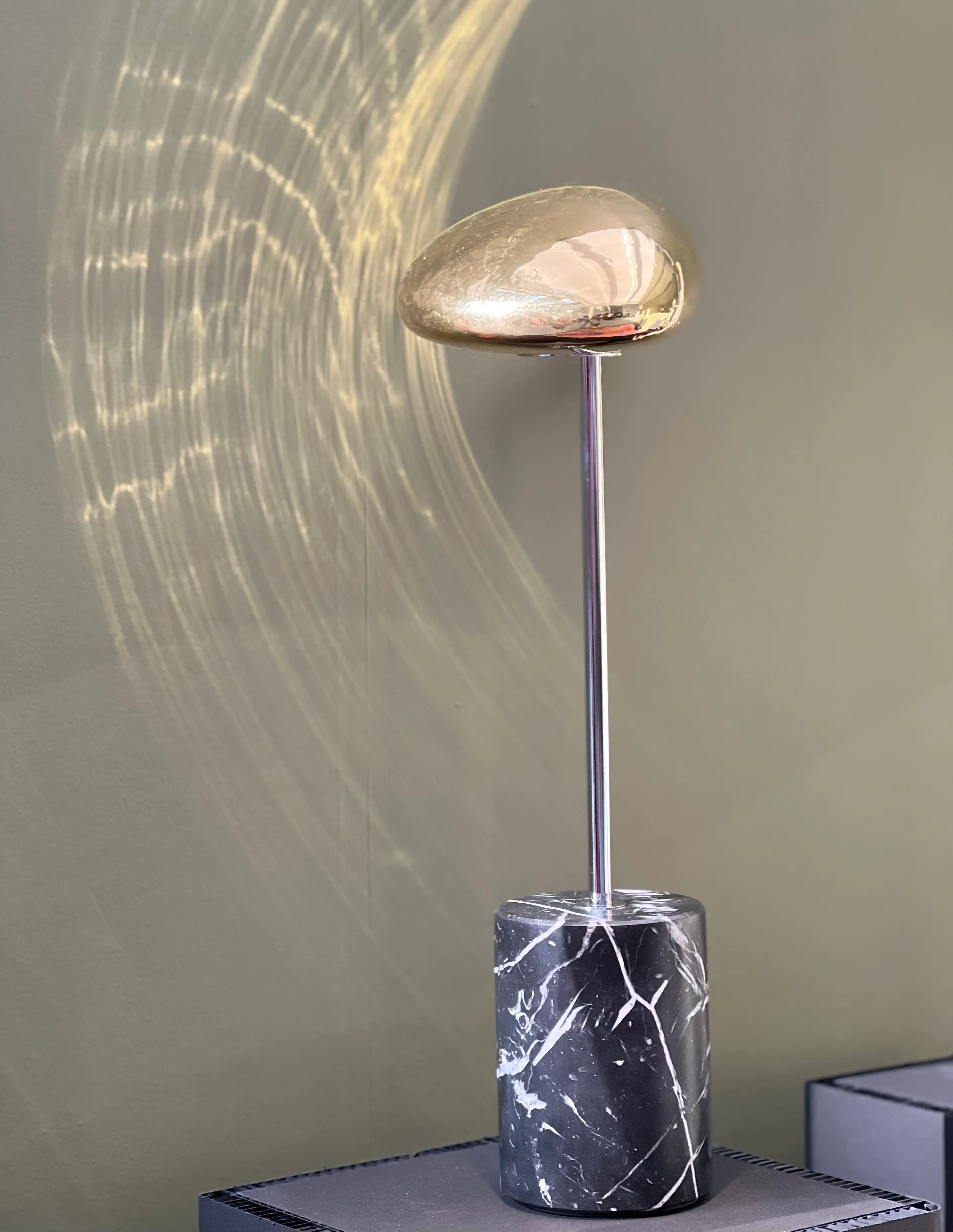 Ensemble, ces deux matériaux fusionnent harmonieusement. Le marbre noir mate ancre l’ensemble dans une esthétique sobre et intemporelle tandis que la céramique dorée rehausse le tout d’un éclat moderne et raffiné. Ce contraste entre l’aspect mate et profond du marbre noir et la brillance chaleureuse de la céramique dorée offre à cette lampe un équilibre visuel remarquable.