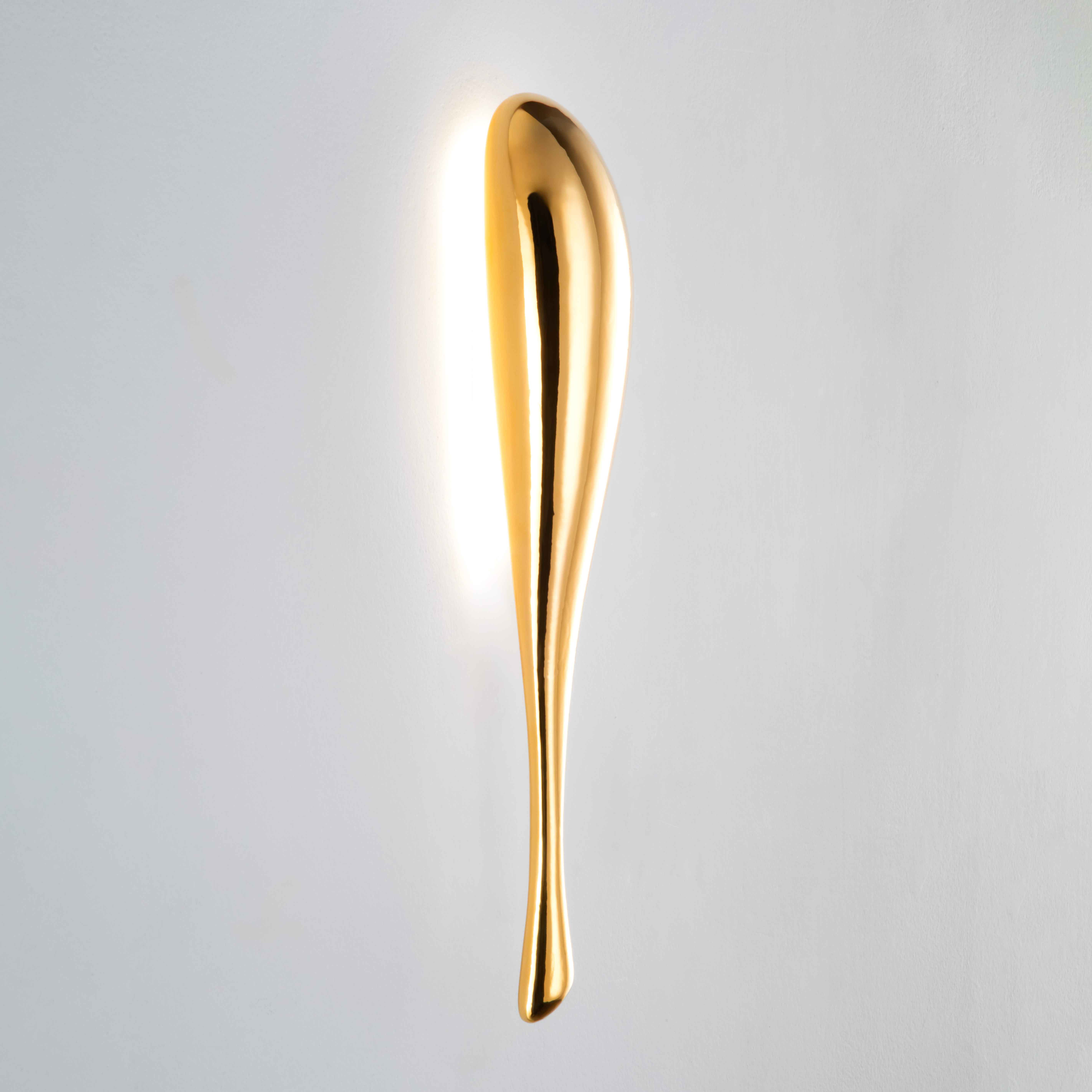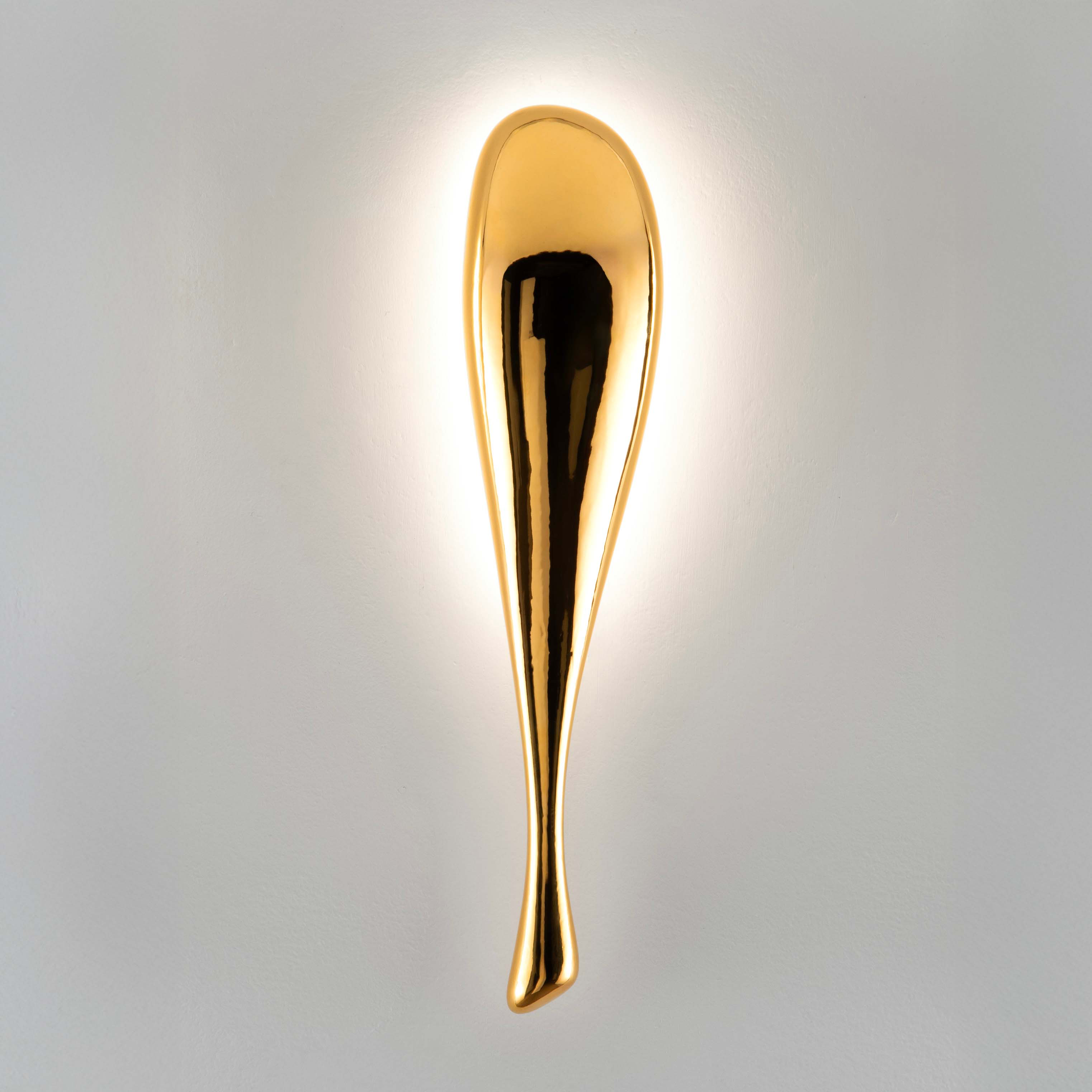 Conçue pour s’adapter à différents contextes, l’applique peut être installée dans les deux orientations: vers le haut pour exprimer la montée et la légèreté, ou vers le bas pour suggérer la fluidité et le mouvement. Sa teinte dorée, à la fois chaleureuse et raffinée trouve naturellement sa place dans des intérieurs élégants, qu’ils soient contemporains, classiques ou éclectiques.