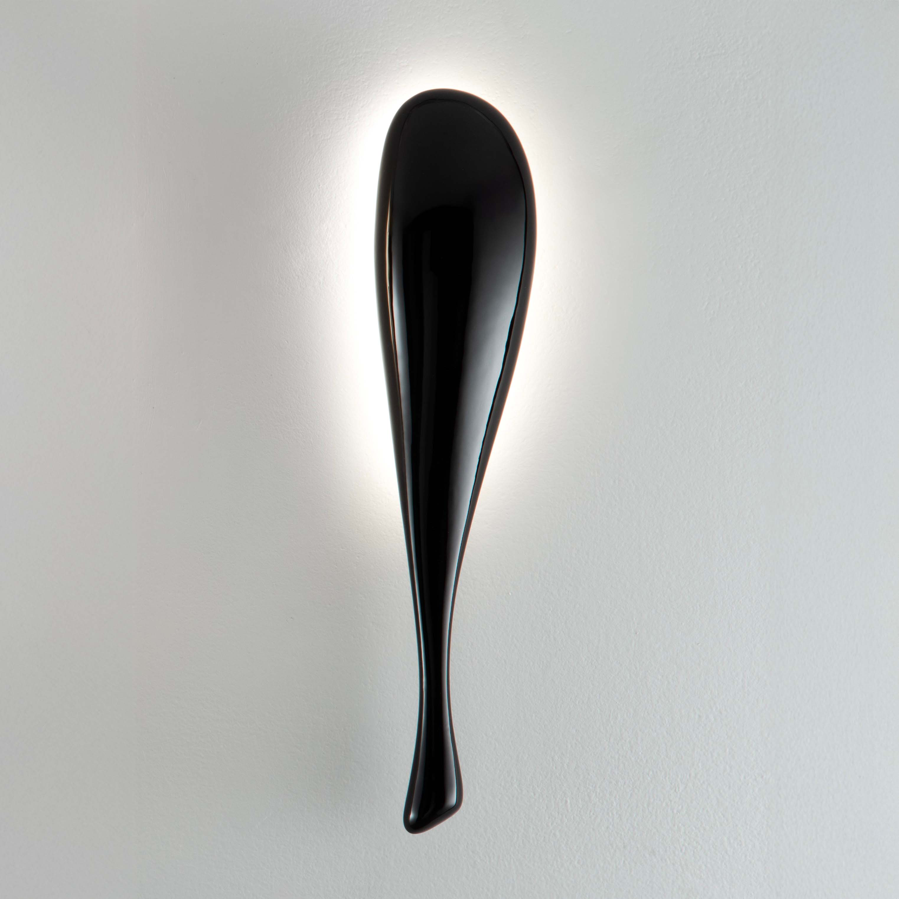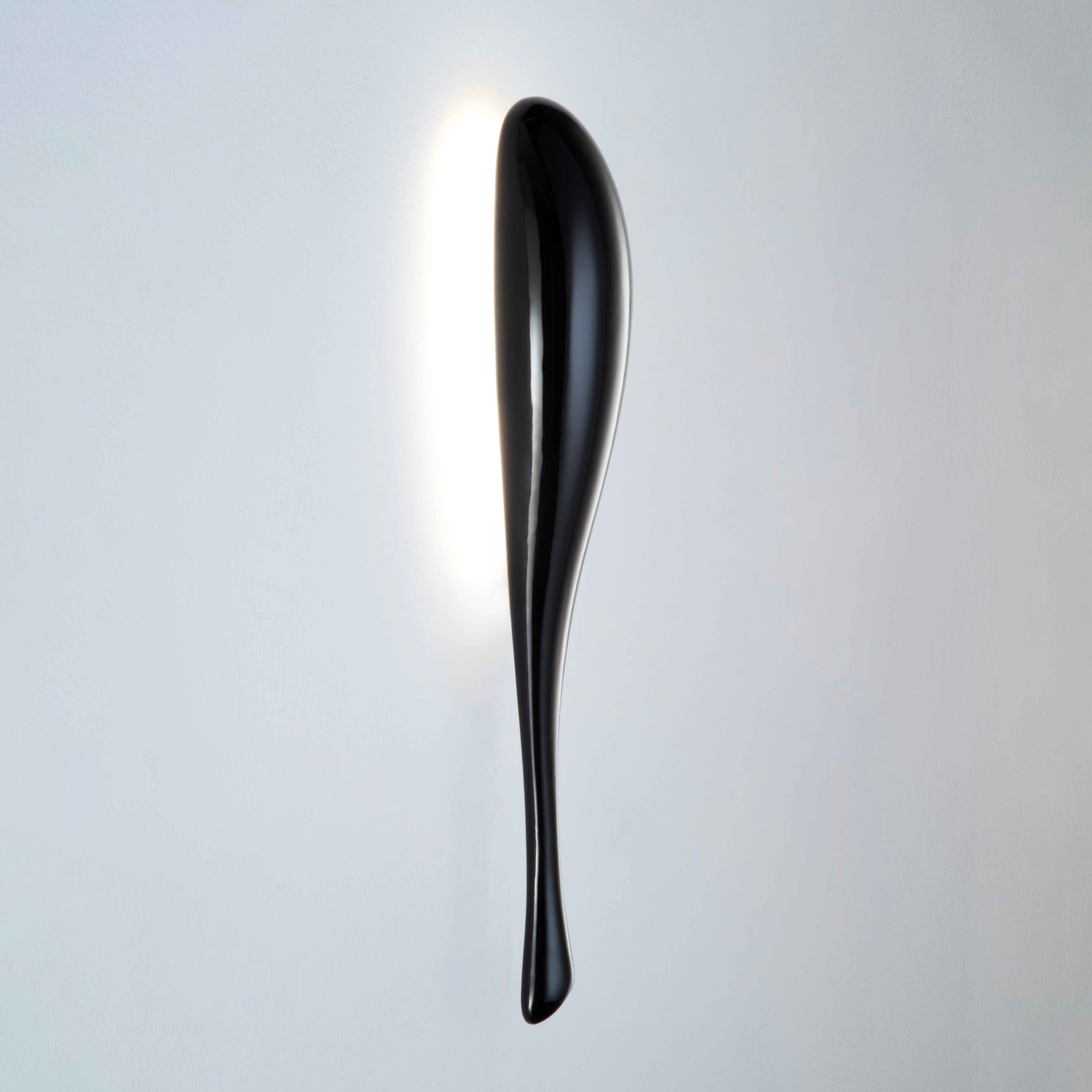Son design organique et élancé évoque la fluidité d’un corps marin ou la déformation d’une goutte d’eau en mouvement. Suspendue au mur, elle semble flotter à la frontière entre matière et lumière. Son noir profond agit comme un écrin révélant la délicatesse du halo lumineux diffusé à l’arrière sur la partie haute de l’applique. Ce contraste entre obscurité et clarté donne vie à une atmosphère à la fois apaisante et énigmatique propice à la contemplation.